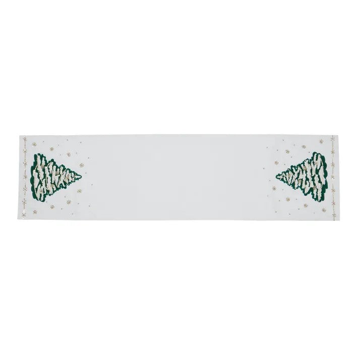 Crafted from soft, durable cream-colored cotton, the runner features a clean, simple design that allows the intricate details to shine. Two stylized Christmas trees, rendered in rich green and sparkling silver embroidery, anchor the ends of the runner. They are surrounded by delicate, glittering stars and snowflakes, adding a festive shimmer.