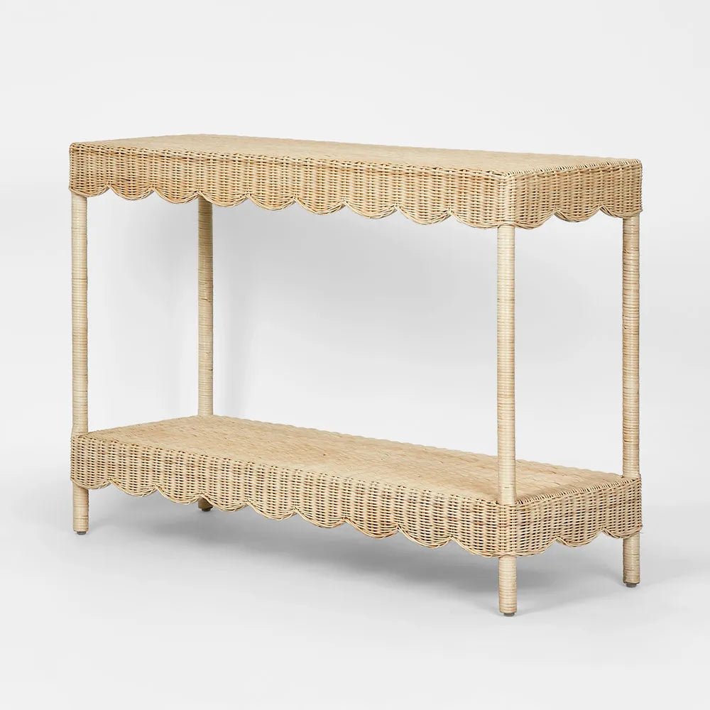 Welcome home to the charm of our Belle Rattan Console, where elegance meets island allure. Crafted from a harmonious blend of wood and rattan, adorned with a delicate wicker weave and finished with a scalloped skirt, this console exudes sophistication with a tropical twist. With a bottom shelf providing additional space for your favorite reads or decorative treasures, it's the perfect fusion of style and function for any discerning space. Not suitable for Outdoor use. Please note: Rattan is not designed for full outdoor use. If placed outdoors or even in covered outdoor areas, it may weather, fade, or change over time due to exposure to sunlight and moisture. We recommend indoor use or placing it in well-protected areas.